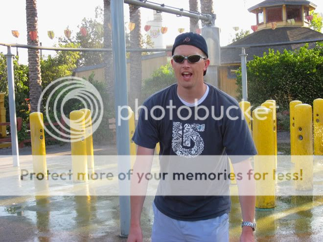 It was pretty hot during the day, but Doug cooled off by going through the misters. Nice.